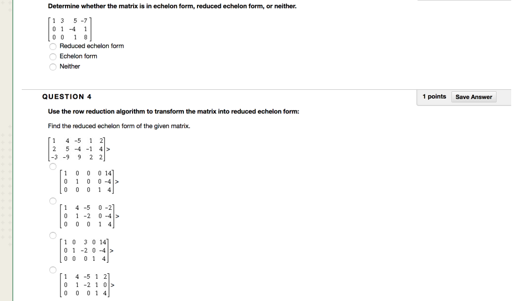 The following example shows you how to get a matrix into reduced row echelon form using elementary row operations. A left begin array lll1 0 0 0 1 0 0 0 1end arrayright b left begin array lll1 0 0 0 1 0 0 0 0end arrayright c left begin array lll0 1 0 0 0 1 0 0 0end arrayright d left begin array.